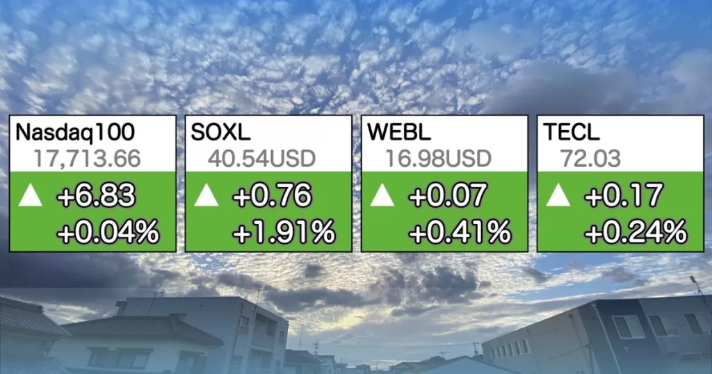 4/17 米国市場 中休み 米国株記事 2024.04.17 8:02 am ちょっとだけ休みの日でした 目次 主要指数 ダウ、S&P500、NASDAQグロース、レバレッジ Nasdaq100, SOXL, WEBL, TECL米国株ファンちゃんねる情報 とれたて米国株速報 主要指数 ダウ、S&P500、NASDAQ 休むも相場ですね グロース、レバレッジ Nasdaq100, SOXL, WEBL, TECL グロースはまぁまぁ良い日でした SOXLは40ドル復帰です 米国株ファンちゃんねる情報 とれたて米国株速報 パウエルちょっとタカ派でした